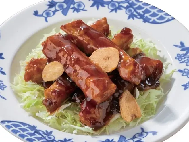• 秘伝!ジューシーとんてき(小皿)449円(税込494円): 濃厚なタレで味付けされたジューシーな豚肉。