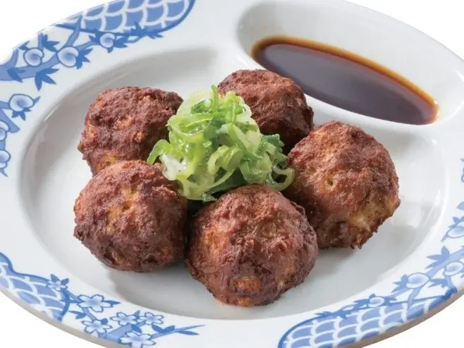 • かりかり肉団子の香味ねぎ添え(小皿)399円(税込439円): 香り豊かな香味醤油で楽しむ肉団子。