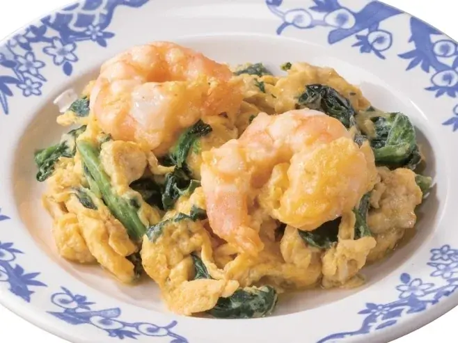 • えび玉ほうれん草炒め(小皿)399円(税込439円): ぷりぷりの海老とふんわりした玉子の組み合わせ。