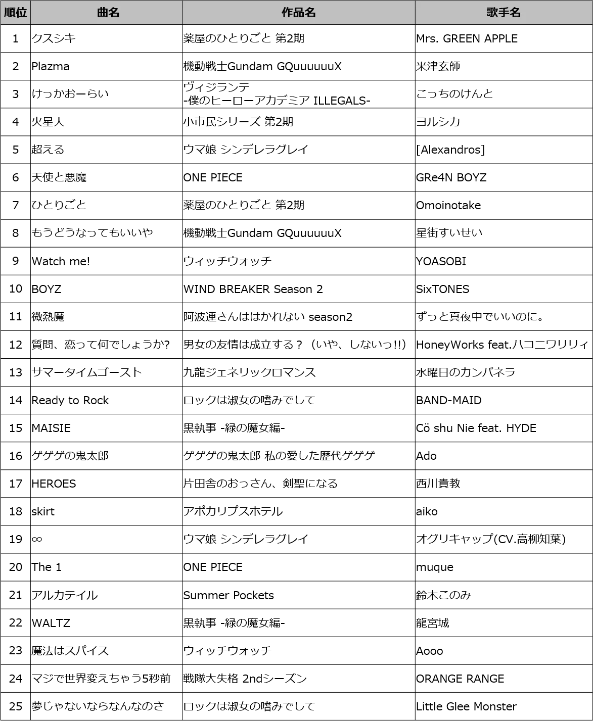 2025年春アニメ主題歌カラオケランキングTOP50発表『薬屋のひとりごと』第2期オープニングテーマMrs. GREEN APPLE「クスシキ」1位音楽評論家・冨田明宏が春アニメランキングを明快解説! 画像 2