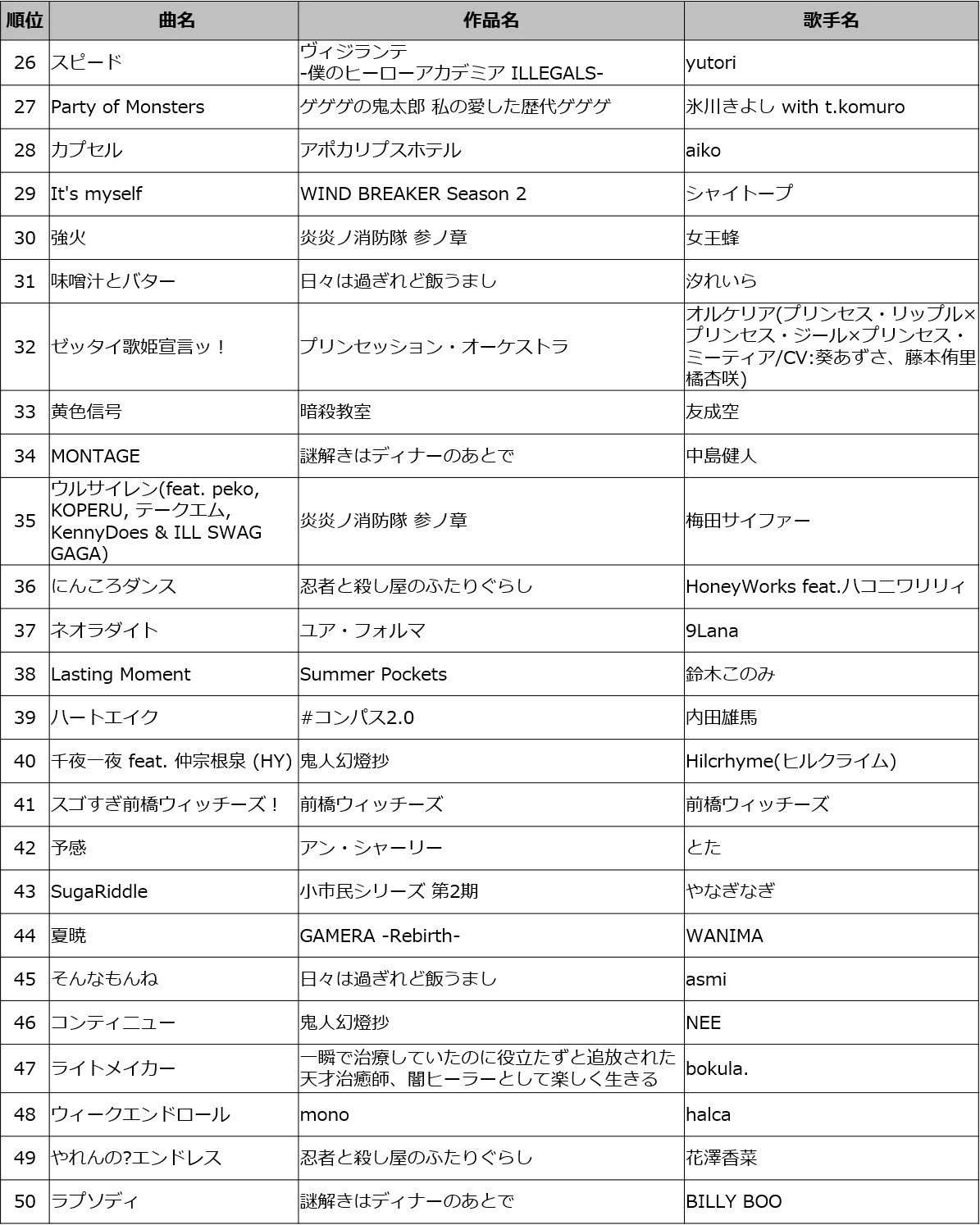 2025年7月11日発表 春アニメ主題歌カラオケランキングTOP50
