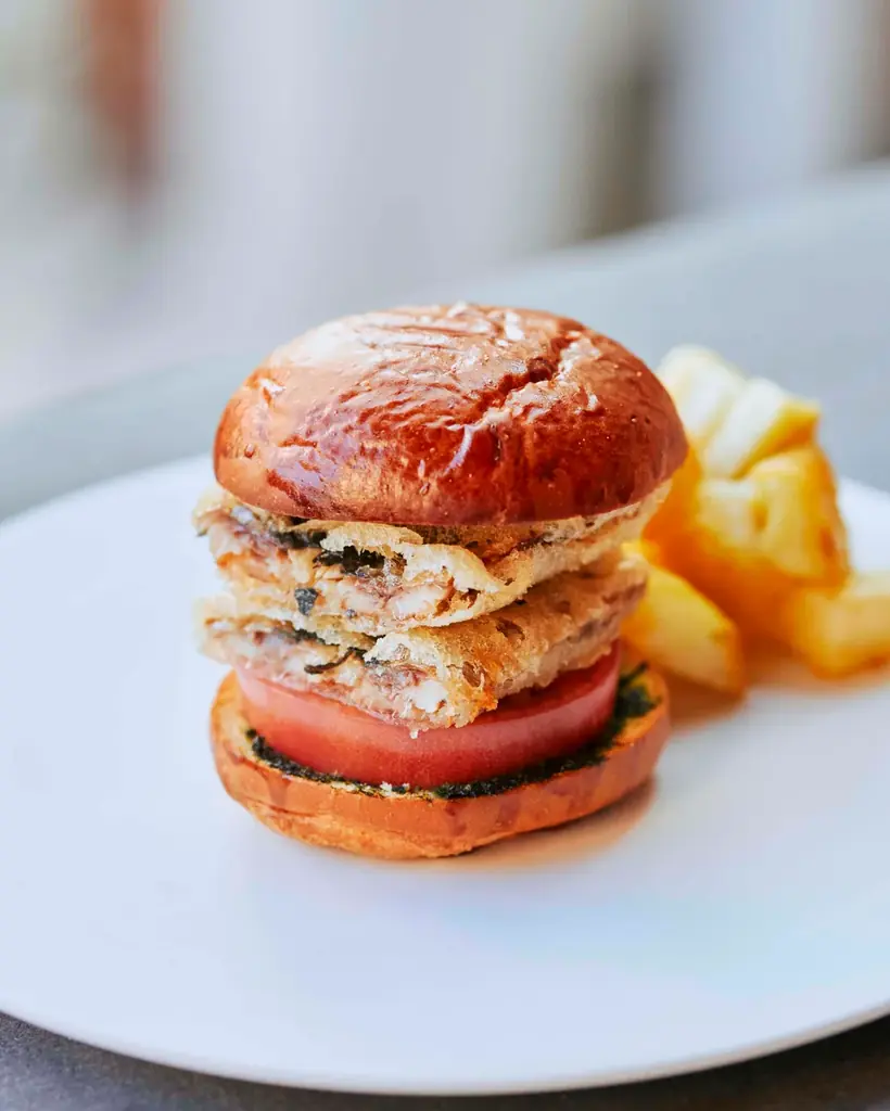 鮮魚のベニエを使用したフィッシュバーガーで、カカオビネガーのタルタルソースと共に提供されます。