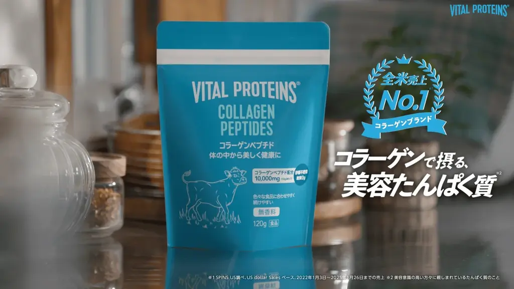 バイタルプロテインズはコラーゲンペプチド100%の美容たんぱく質ブランドで、無香料・砂糖不使用。飲み物や料理に溶けやすく、肌や関節の健康をサポートします。