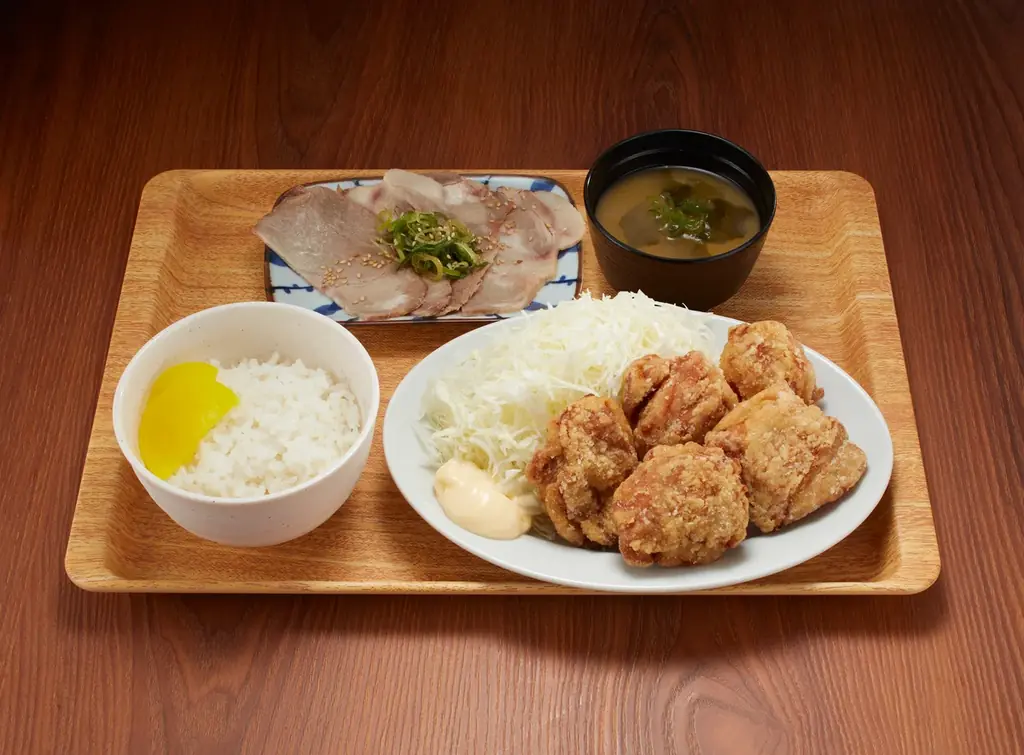 | 唐揚げ定食 | 唐揚げ5個、ねぎ塩チャーシュー、ライス、味噌汁 | ジューシーな唐揚げ5個に、人気のねぎ塩チャーシューを添えた満腹定食。 |