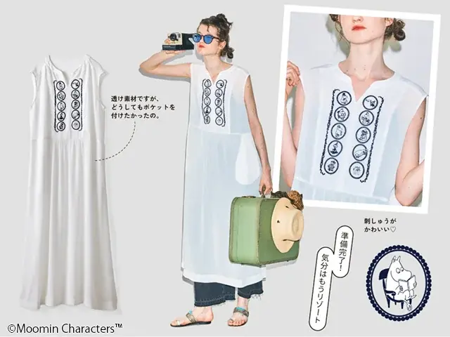 このワンピースは、楊柳素材で作られており、上品な透け感が特徴です。胸もとには、ムーミンたちの肖像画のような刺しゅうが施されています。ウエスト切り替えのデザインにより、軽やかに揺れるシルエットが魅力的です。デニムやパンツとのレイヤードコーディネートも楽しめ、個性的なポケットがアクセントになっています。