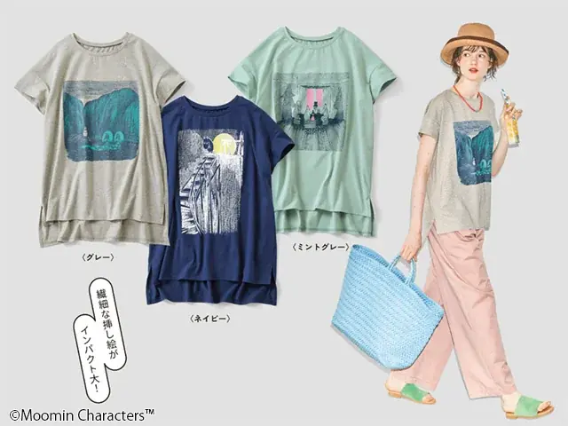 小説『ムーミンパパ海へいく』から選ばれた挿し絵が大胆にプリントされたTシャツです。大人っぽいクスミカラーのグレー、ネイビー、ミントグレーの3色展開で、長めのチュニック丈やサイドスリットが特徴です。ボディラインをカバーしつつ、一枚でおしゃれに着こなせるアイテムです。