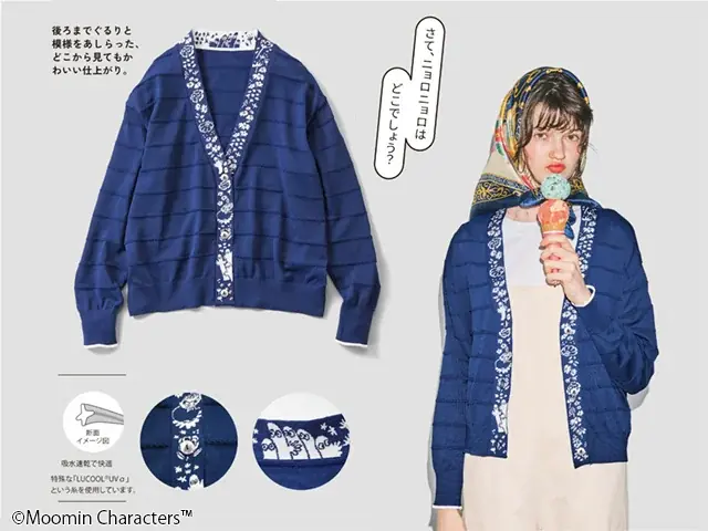 鮮やかなブルーに白い模様編みが映えるこのカーディガンは、リトルミイやニョロニョロ、ムーミン谷の花々が編み込まれています。ショート丈のデザインで、ワンピースや丈の長いトップスとの重ね着が楽しめます。吸水速乾機能のある糸が使用されており、着心地も良好です。
