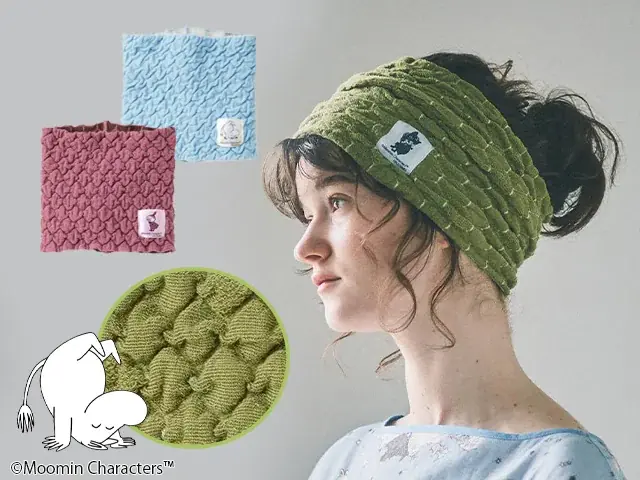 濡れた髪にかぶるだけで時短になる吸水素材のヘアターバンです。ムーミンたちのイラストがプリントされており、キャラクターをイメージしたカラー展開が魅力です。リラックス感のあるデザインで、裏地との配色も可愛らしいです。
