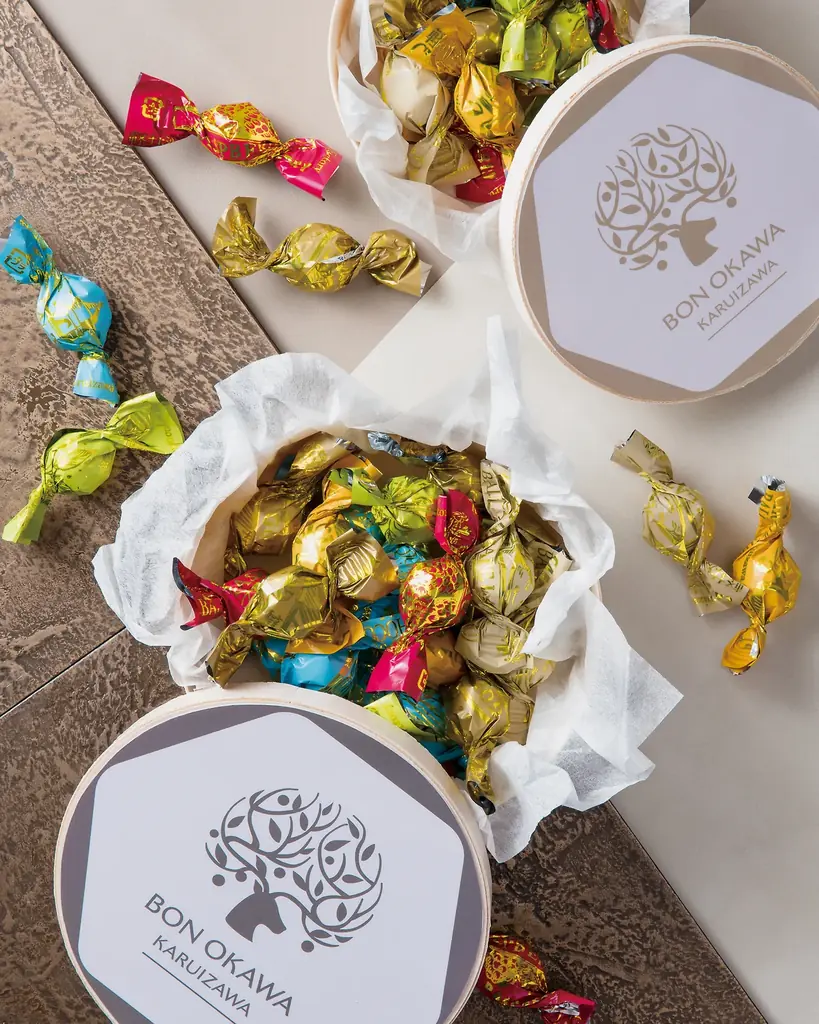 Bon Okawaは、軽井沢町に本店を構えるカラフルで可愛いチョコレートとラスクのお店です。店舗内にはチョコレート専用の工場があり、ガラス越しに製造工程を見学することができます。
