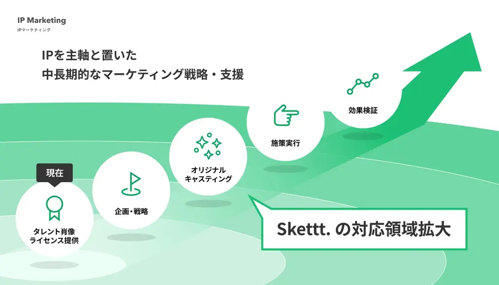 SketttはIPマーケティングプラットフォームで、有名タレントの宣伝素材をサブスク提供し、企画から効果検証まで包括的に企業の認知拡大や売上向上を支援します。