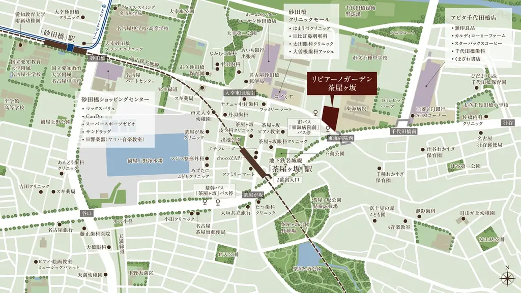 「リピアーノガーデン茶屋ヶ坂」は、地下鉄名城線「茶屋ヶ坂」駅から徒歩5分という立地にあり、周辺には生活に必要な施設が充実しています。徒歩3分の距離にはスーパーマーケット「コノミヤ砂田橋店」、徒歩6分には「アピタ千代田橋店」があり、日常の買い物に非常に便利です。また、医療、金融、飲食、子育て施設も集約されており、高い利便性を誇ります。