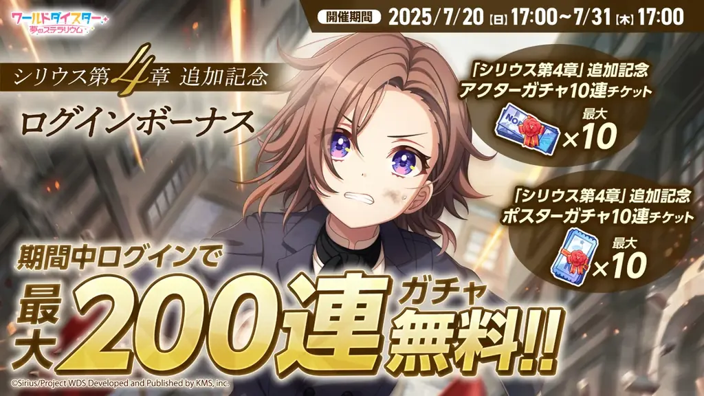 『シリウス 第4章』の追加を記念して、特別ログインボーナスが開催されます。期間中にログインすることで、アクターガチャが最大100連、ポスターガチャが最大100連引けるチャンスがあります。