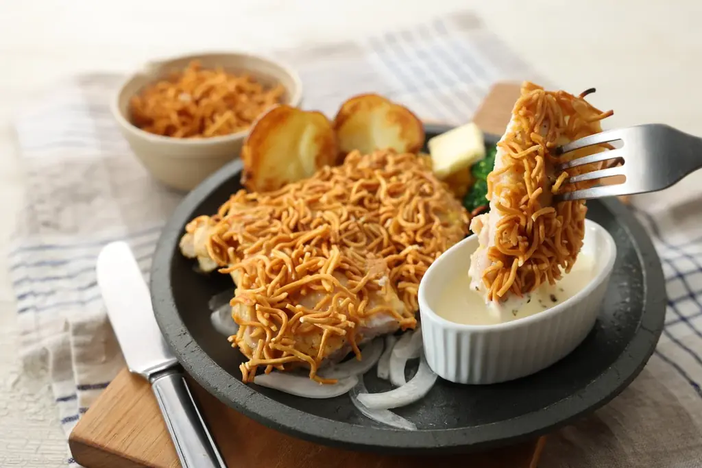 ※パン食べ放題ご注文の方限定。イギリスパンを平らにのばし、ケチャップとベビースター、チーズをたっぷりのせて焼き上げた、ピザのような味わいのパンです。 - 料理部門・第1位:ベビースターグリルチキン チーズソース:1,309円(税込)
