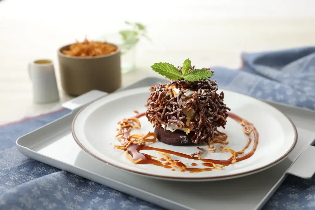 薄く焼き上げた濃厚ブラウニーの上にバニラアイスをトッピングし、ベビースターラーメンとチョコを混ぜたザクザクチョコを加えたデザートです。