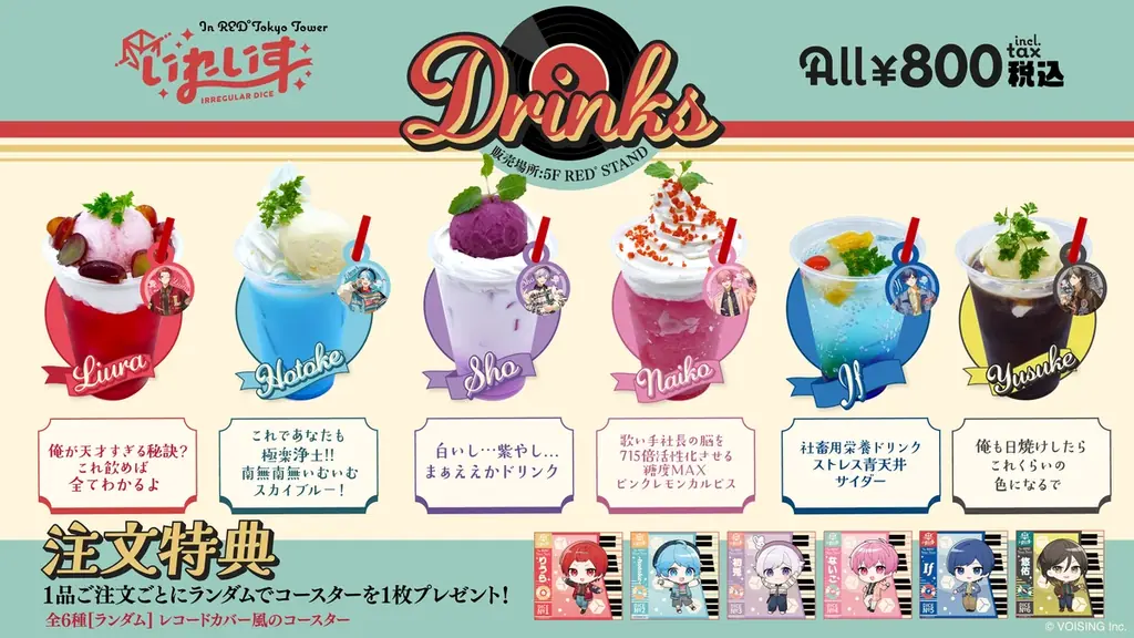 さらに、ドリンクを注文すると、描き下ろしイラストをあしらったレコードカバー風コースターがランダムでプレゼントされます。これにより、昭和の音楽喫茶に立ち寄ったようなレトロな雰囲気を楽しむことができます。