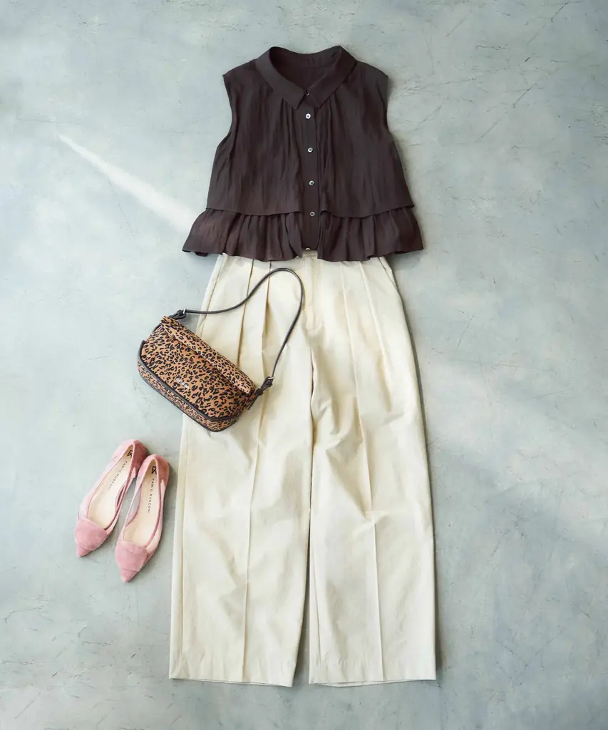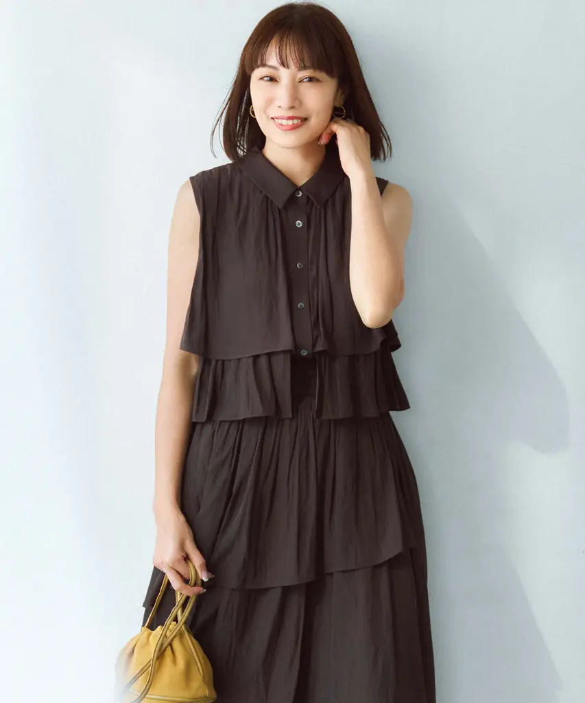 ノースリーブブラウスは、前後どちらでも着用可能なデザインが特徴です。裾フリルが施されており、イン&アウトのスタイリングが楽しめます。大人シックなブラウンの色味には、入江さんのこだわりが詰まっています。