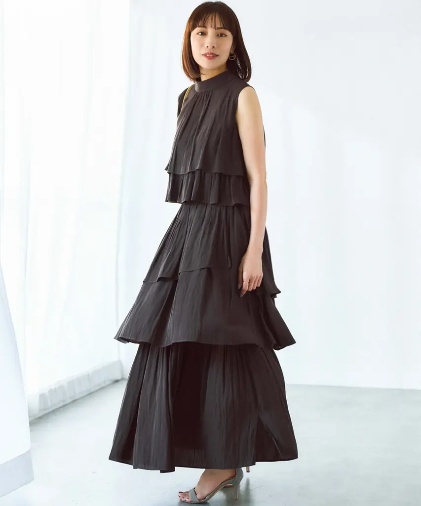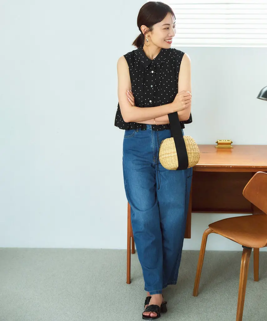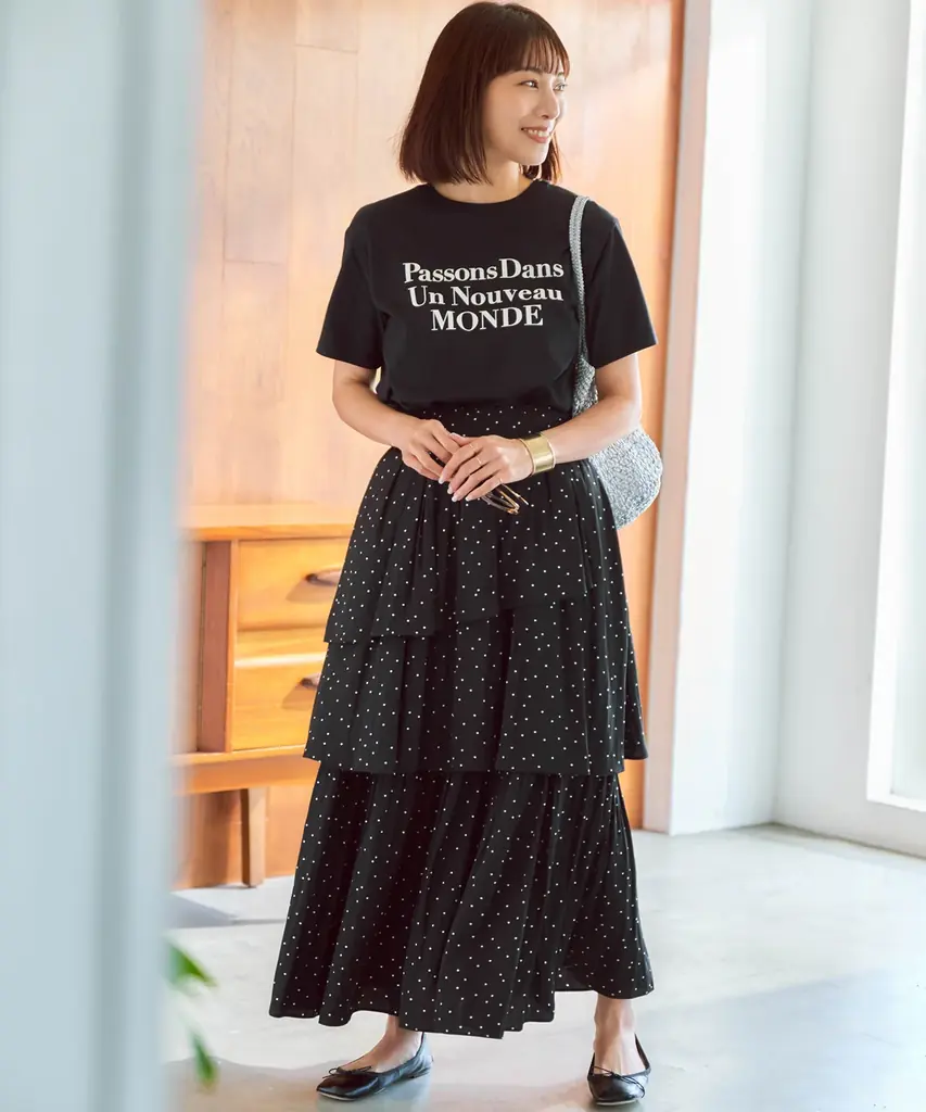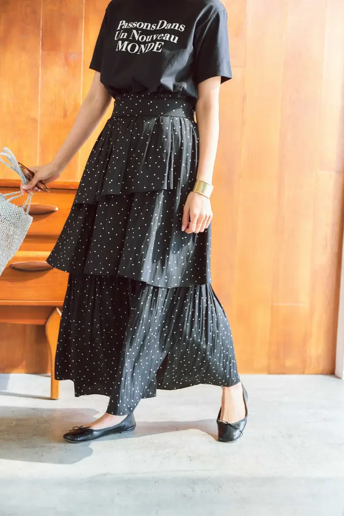 ティアードスカートは、レングスの長さを変えられるため、さまざまなスタイルに合わせることができます。インしたときにウエストのあしらいが効いているのがポイントで、甘くなりすぎないランダムドットデザインが夏の黒コーデを華やかに演出します。