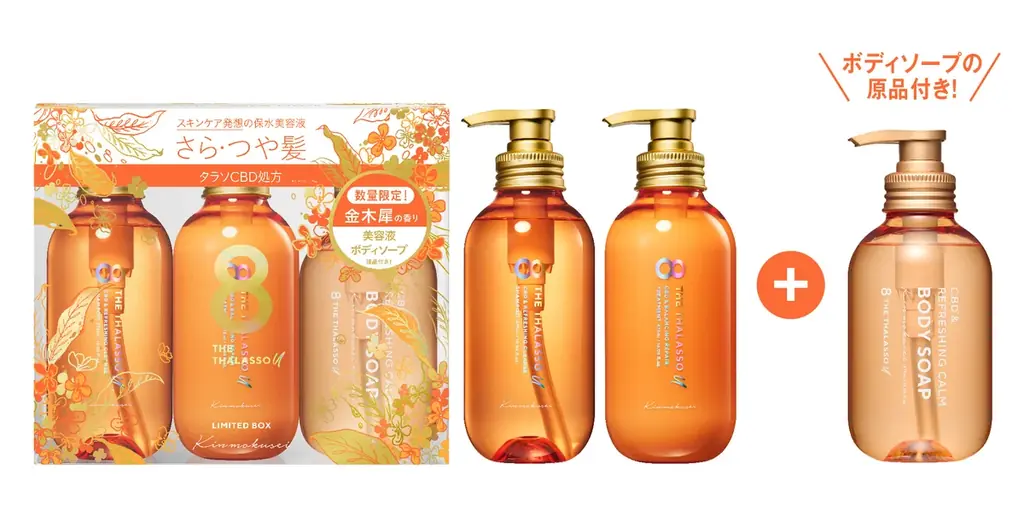 「エイトザタラソ ユー」は、ジェンダーレスで使えるユニセックスラインとして展開されており、金木犀の香りのボディケアアイテムがセットになった限定キットが2種類登場します。これらの製品には、タラソCBD*処方が採用されており、髪と地肌をしっとり保水してダメージを補修します。