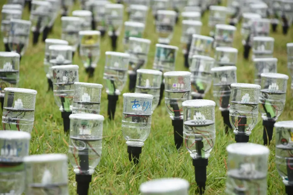オヂヤホタルでは、太陽エネルギーを利用した環境に優しいイルミネーションが特徴です。具体的には、太陽光発電パネルと充電池、LEDを組み合わせた「ペットボタル®」を使用しています。周囲が暗くなると、LEDが自動的に点灯し、15分間隔で色が変わりながら約4時間点灯します。
