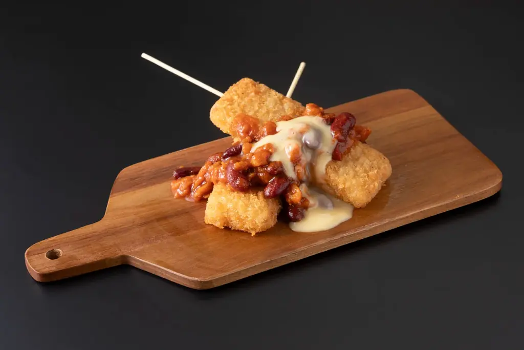 説明:蒟蒻ミートのカツに、コクのあるチーズ代替植物性食品使用のチリソースをかけたスティックカツです。揚げたてのカツの食感と、チリソースのスパイシーさが絶妙にマッチします。