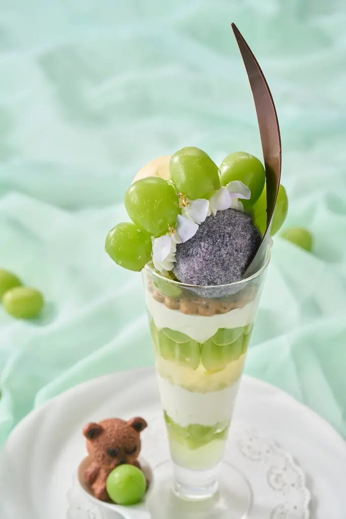 このデザートは、旬のシャインマスカットをふんだんに使用したパフェです。トップには、シャインマスカットや巨峰のシャーベット、アイスミルクがあしらわれています。グラスの中には、爽やかなレモンゼリー、ナタデココ、クレームダンジュなど、見た目も食感も楽しめる層が重なり合っています。食べ進めるごとに、シャインマスカットと冷たいアイスクリーム、そしてスイーツのハーモニーが口いっぱいに広がります。