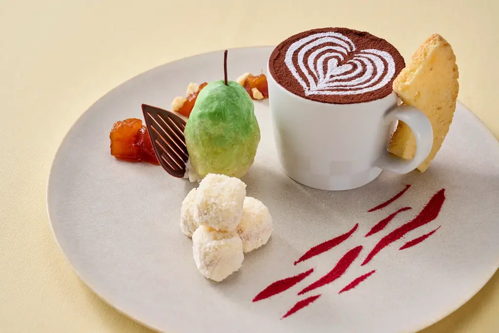 このデザートは、旬の洋梨を主役にした秋限定のスイーツです。可愛らしい見た目の洋梨は、ほろ苦いキャラメルと優しい甘みの洋梨シャーベットをチョコレートでコーティングしています。また、コーヒーカップの中には、マスカルポーネのムースとコーヒー風味のスポンジケーキが層を重ねた濃厚なティラミスが用意されています。色鮮やかなラズベリーパウダーがアクセントとなり、ローストナッツのカリッとした食感とのコントラストが心地よい一品です。