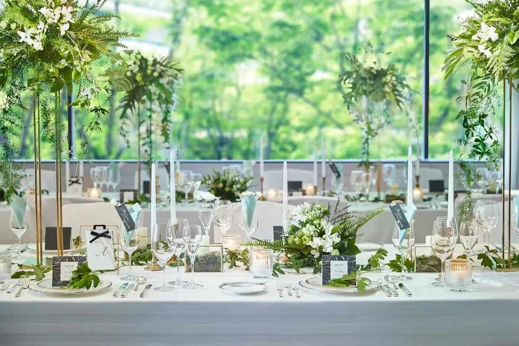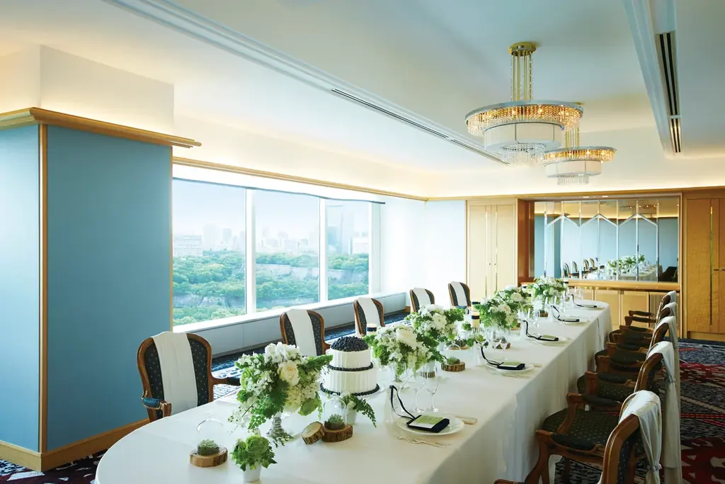 和婚を希望する方向けに、ホテル内の神前会場でも模擬挙式が行われます。披露宴会場は少人数向けから大規模な会場まで幅広く用意され、窓外の緑を活かした会場や最上階からの眺望、シャンデリアが輝く豪華な空間などさまざまなコーディネートが可能です。