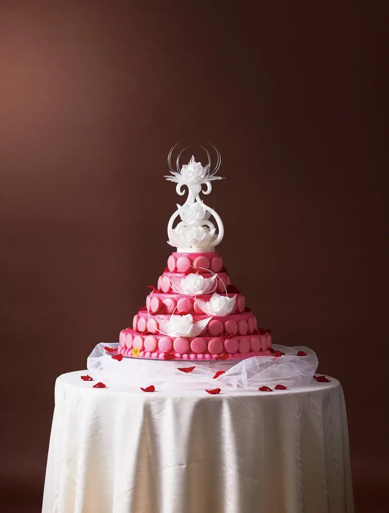 ホテルパティシエによるおよそ10種のウエディングケーキが展示されます。『ピエール・エルメ・パリ』の代表作『イスパハン』をアレンジしたケーキも展示対象に含まれており、個性豊かなケーキの選択肢が紹介されます。