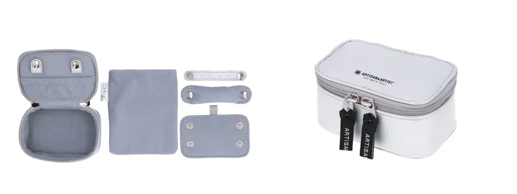 アクセサリーの整理・保管および持ち運び向けのミニケース。ネックレスの絡まりや細かなアクセサリーの紛失を防ぐ構造で、立体的な収納部により出し入れが容易に行える。付属の袋は腕時計収納やアクセサリー同士の衝突防止のクッションとしても使用可能である。