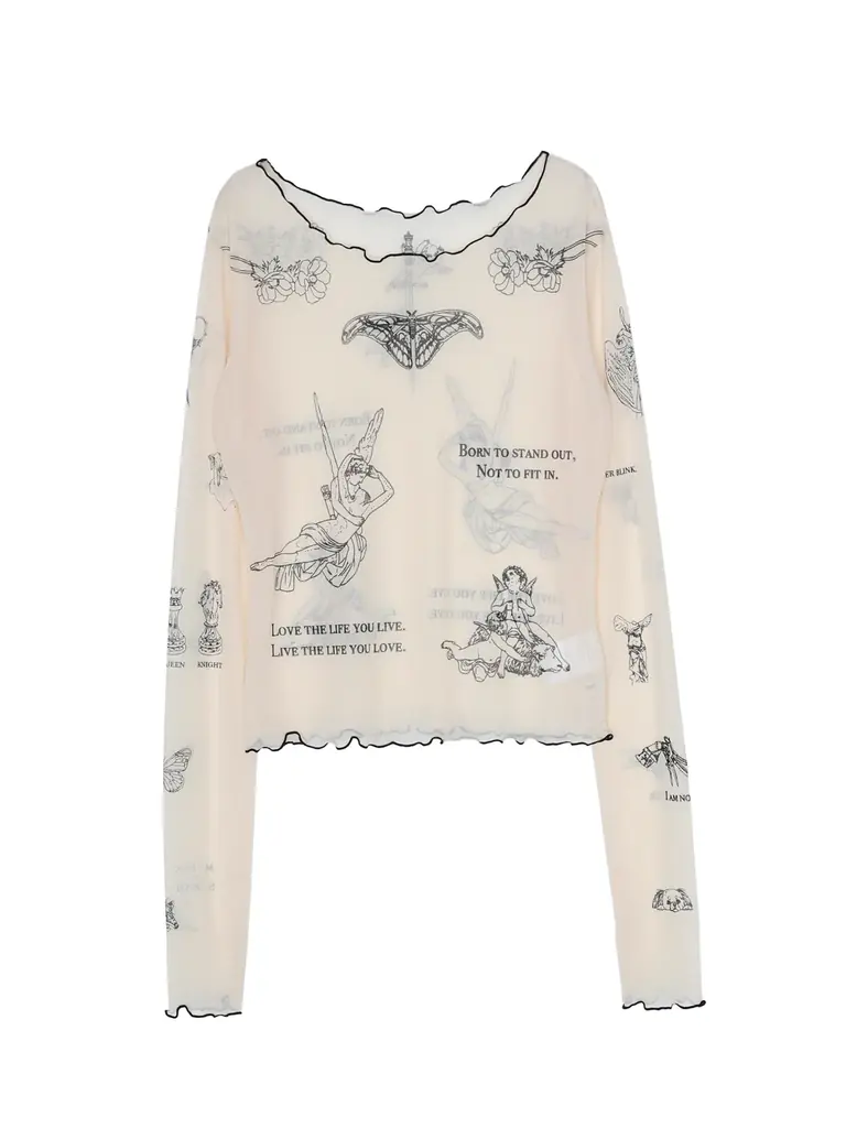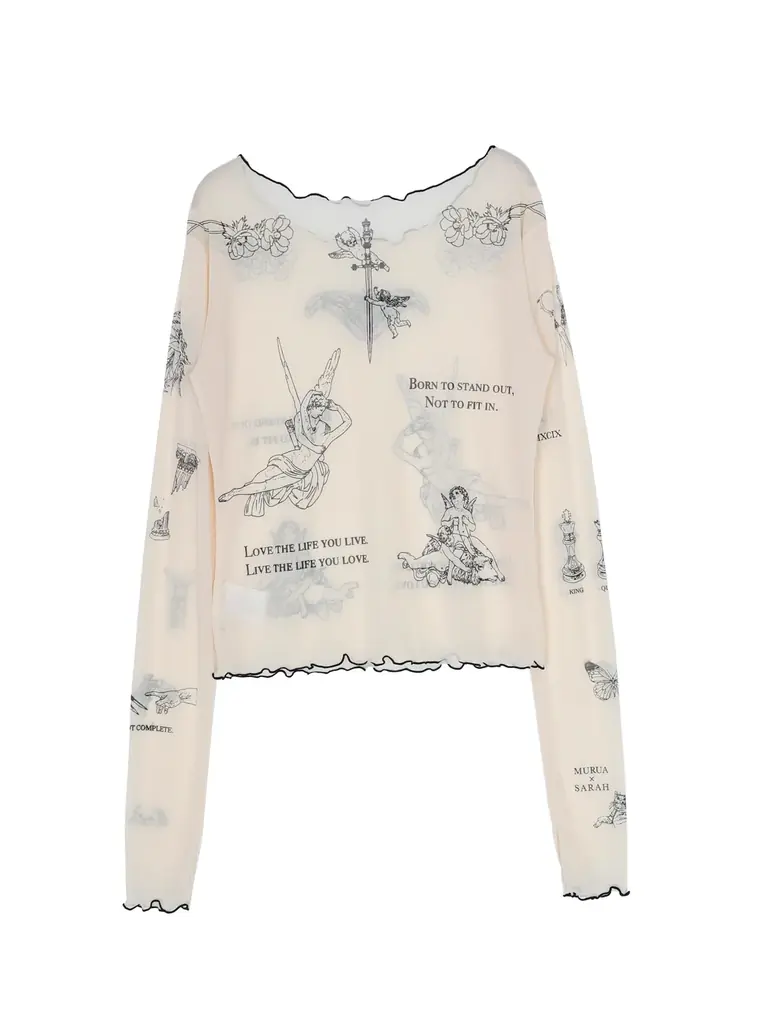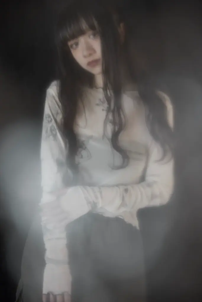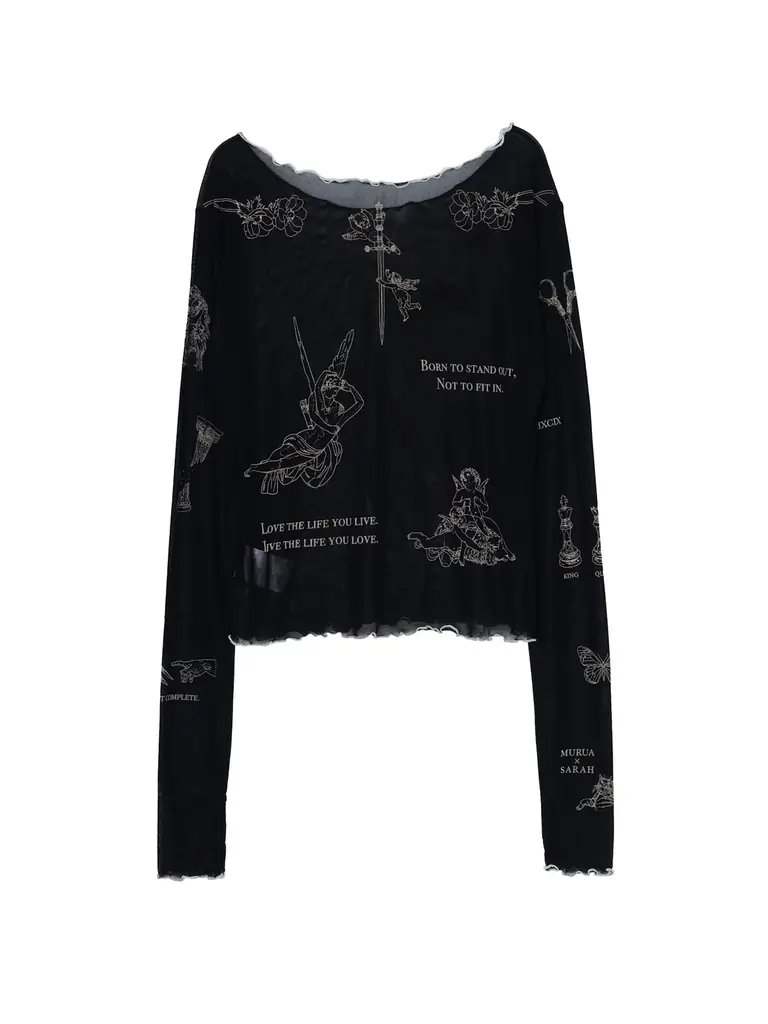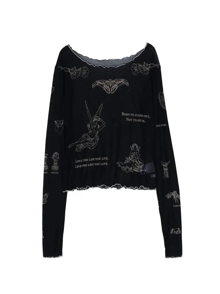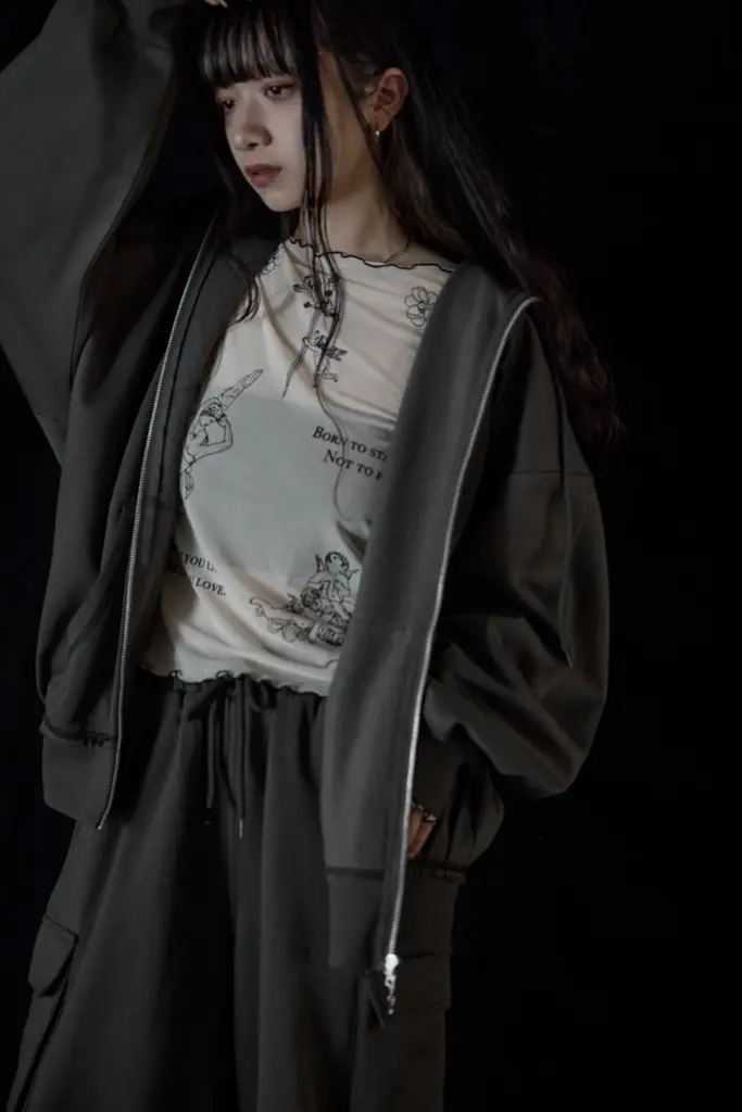 シアートップスは、タトゥーの“ライン”や“影”を意識したプリントと透け感を組み合わせたデザインです。重ね着のインナーとして、あるいは単体でのアクセント使いとしても機能するアイテムです。