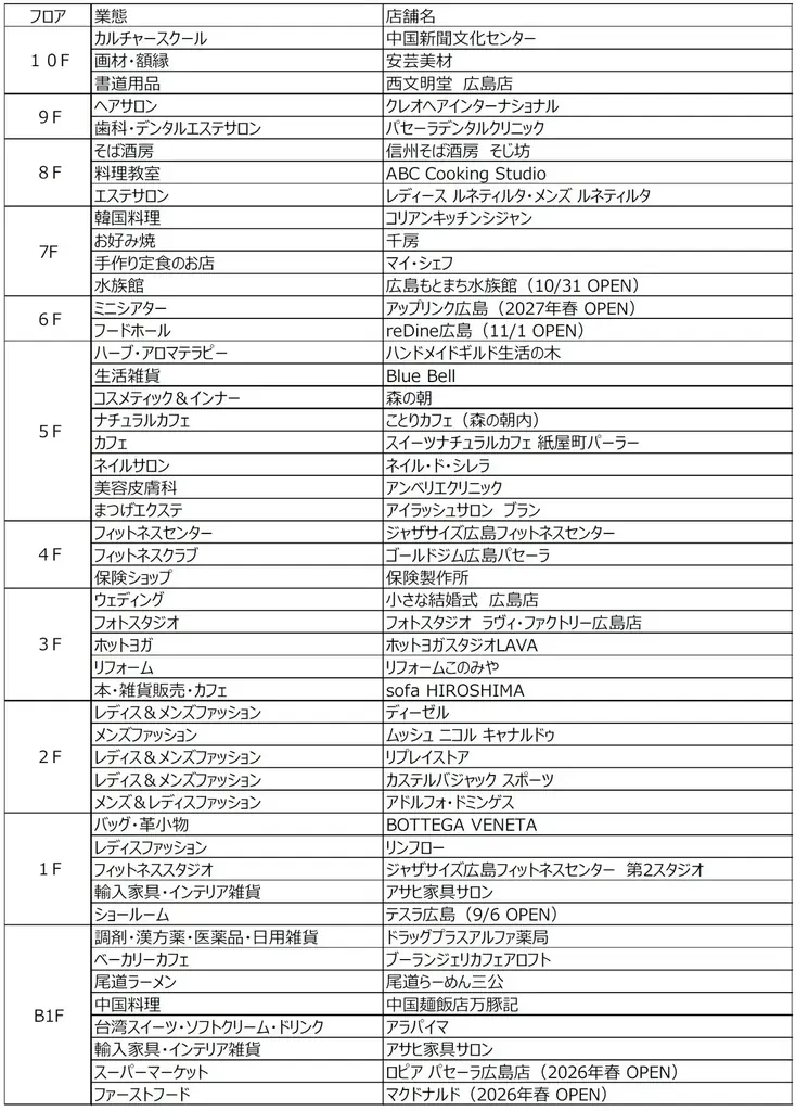確定した開業日はテスラ広島が2025年9月6日、広島もとまち水族館が2025年10月31日、reDine広島が2025年11月1日。ロピアとマクドは2026年春、アップリンクは2027年春開業予定です。