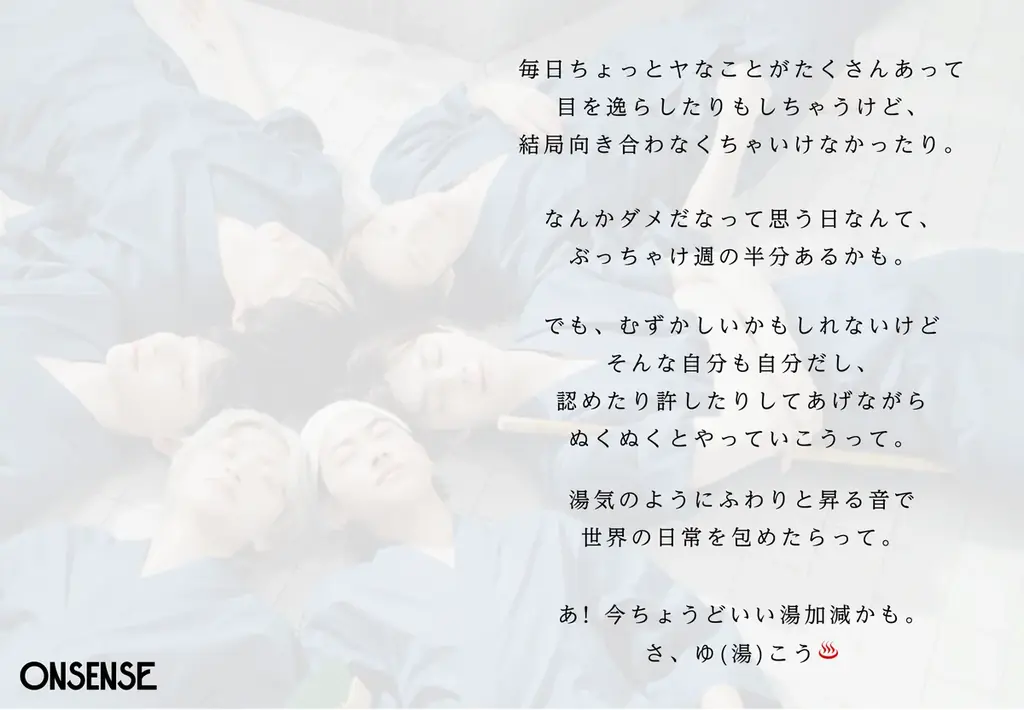 グループ名は日本の伝統的な要素「温泉(ONSEN)」と「センス(SENSE)」を組み合わせた造語で、メンバーは「湯気のようにふわりと昇る音楽やテーマで世界の日常を包む」ことを目指すとしている。メッセージは、毎日のちょっとした落ち込みやつらさを認めつつ「自分のペースでぬくぬくとやっていく」というものだ。