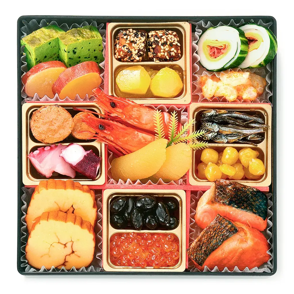 吟味した海の幸を中心に、おめでたい海老や数の子、いくら醤油漬けなどの魚介、さらに伊達巻や栗きんとん、黒豆といった伝統的なおせちの定番も含まれます。見た目にも華やかに仕上がっています。