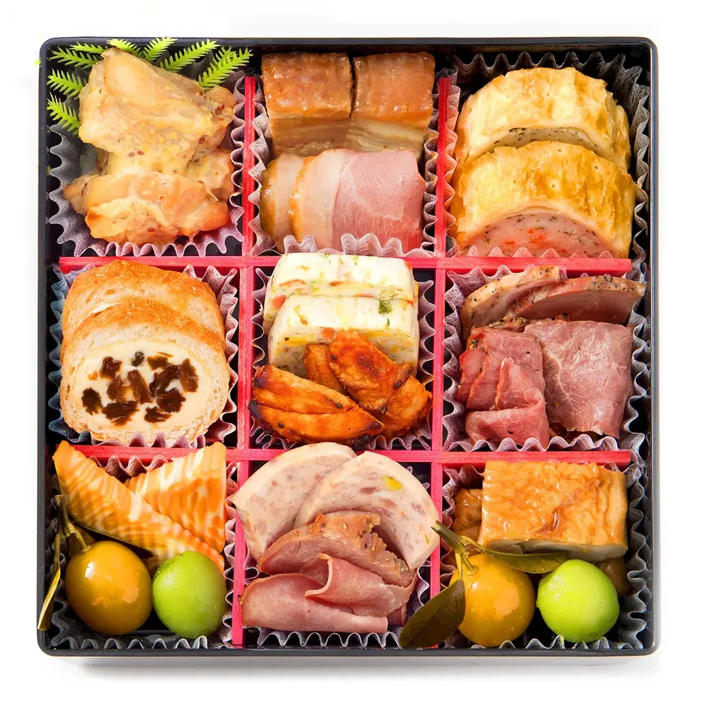 重箱は加賀の伝統的技法を想起させる仕様で製造され、素材やサイズは日本製にこだわっています。冷蔵で盛り付け済みの状態で到着するため、解凍や盛り付けの手間がなく、12月31日に届いたものをそのまま1月1日の食卓に出すだけで楽しめます。