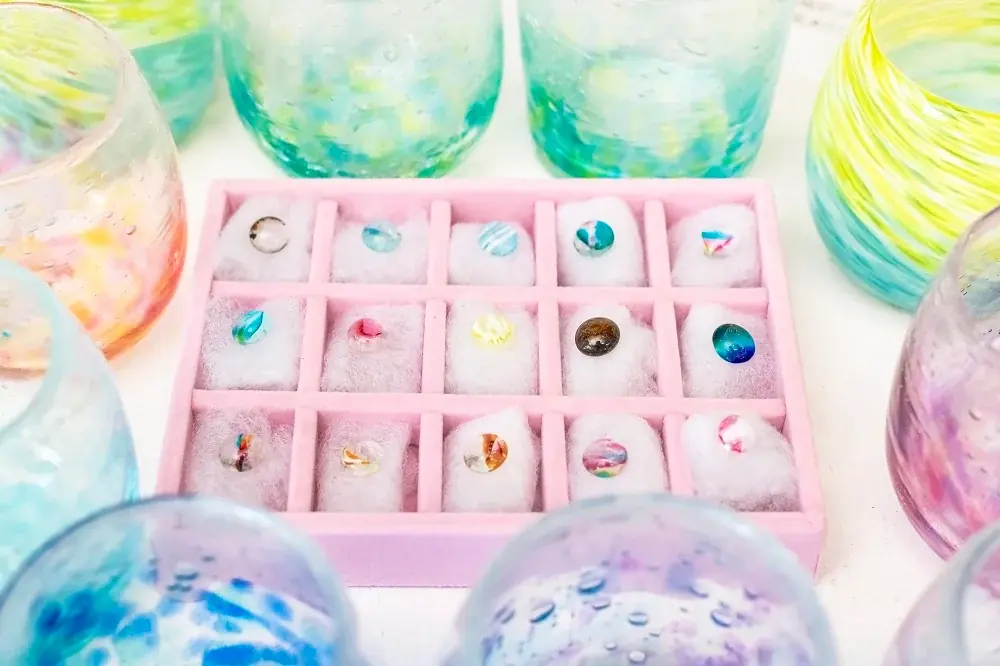 本商品のもう一つの柱は、沖縄県産の伝統工芸である琉球ガラスをランドセルの金具・錠前に採用したことで、工芸品を日常に取り入れる設計思想である。選べるガラスの種類によって光の反射や色味が異なり、同じ本体カラーでも表情が変わる。
