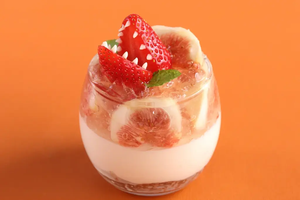 | いちごのパックンモンスター | 800円 | 赤ワインシロップを染み込ませたサバランの上に、マスカルポーネのムース、いちじくのコンポートといちごのジュレを重ね、モンスターの口に見立てたいちごをトッピングしました。 |