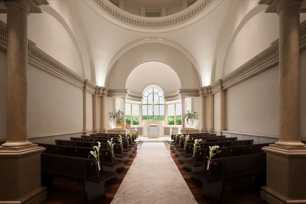 チャペルの基本デザインは古代ギリシャ・ローマを範とした直線的で力強い造形と、ルネサンス様式の荘重な装飾という従来の美意識を受け継いでいます。今回のリニューアルでは、色調・形状・光の配合を見直し、空間のノイズを抑えることでより明るくモダンな印象へと更新しました。