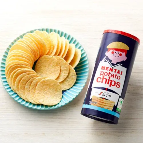 - めんたいポテトチップス:216円(税込)。ふくやの明太子を漬け込んだ後の調味液を粉末状にしたオリジナルパウダーを使用したポテトチップス。3本セットで756円(税込)の取り扱いもある。
