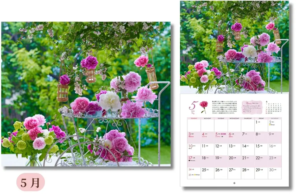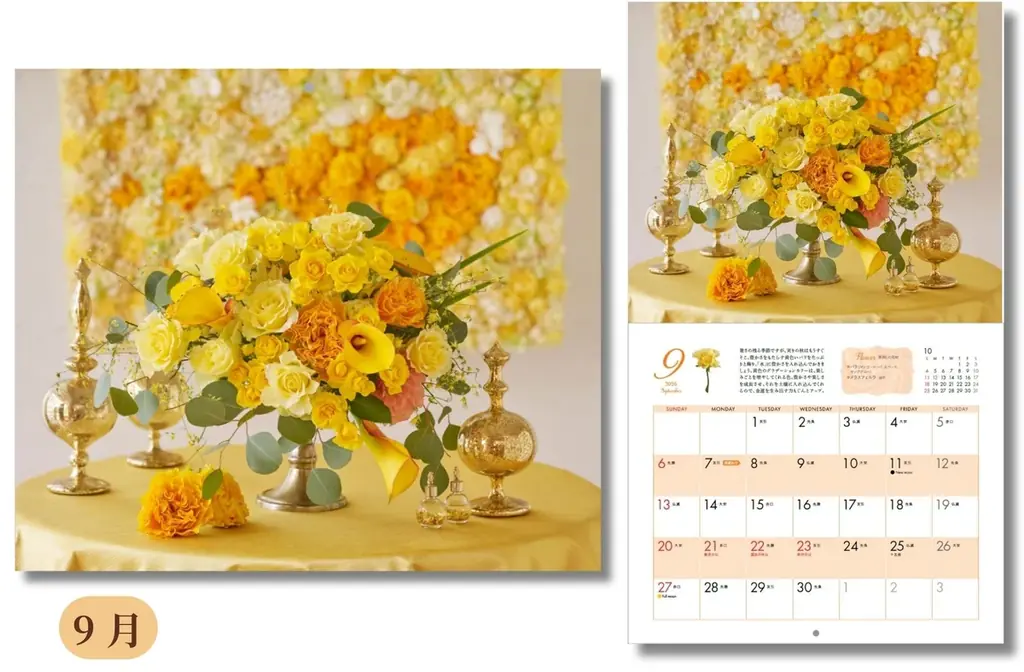 カレンダーとしてのビジュアルの美しさだけでなく、風水効果を意識した配置や花材の選定がされている点が特徴です。贈り物としても好評で、家やオフィスなどさまざまな空間で飾られることを想定して作られています。