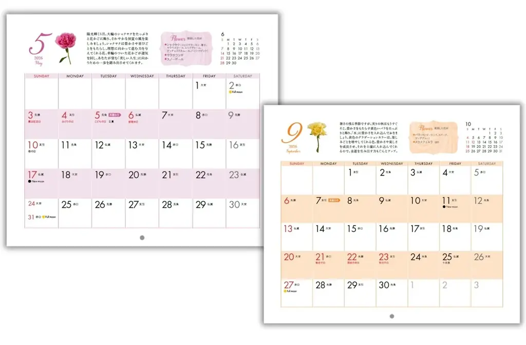 花は風水において空間に生気を呼び込む重要な要素とされています。本カレンダーは、写真に写る花の生気が空間に影響を与えることを意識して制作されており、生花を常に飾れない場合でも写真を飾ることで同様の効果が得られるという考え方に基づいています。