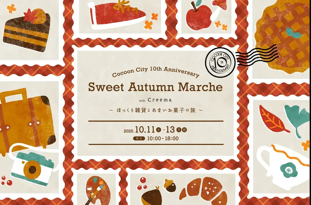 「Sweet Autumn Marche」は、手仕事の雑貨や秋のスイーツに焦点を当てた3日間のマルシェで、ワークショップやライブペイントも予定されています。会場はコクーン2・1F おもてなしプラザとひかりストリートです。