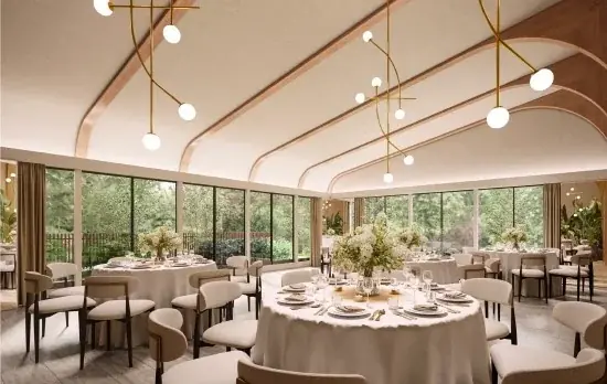 「The Nest」は少人数専用のバンケットで、ガーデンヒルズ迎賓館 大宮に新設されます。水音が響く「滝のチャペル」と青空を望む「天空のチャペル」から挙式スタイルを選べるほか、オープンキッチンや完全貸切の邸宅空間が特徴です。