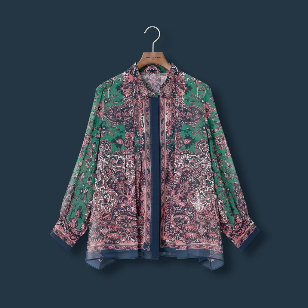 ラッティ社は1945年創業の歴史を持ち、世界各国のメゾンから支持されるプリント生地メーカーとして知られる。芸術的なデザイン、鮮やかな色彩表現、持続可能な素材への配慮を併せ持つ同社のプリント技術が、クリスチャン・オジャールのブランドアイデンティティであるペイズリープリントをより一層引き立てる組み合わせとなっている。