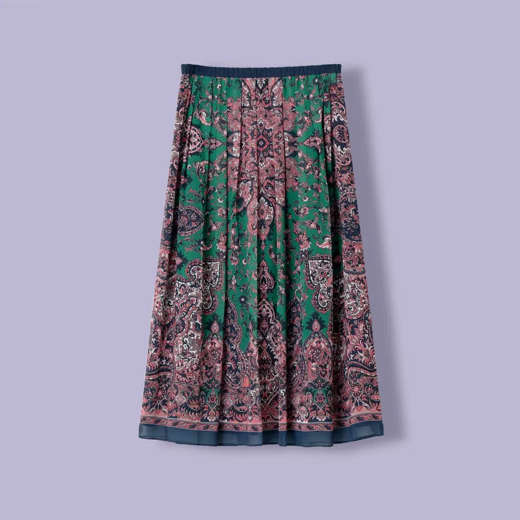 特徴:パネルプリントを巧みに配置したタックフレアスカート。歩くたびに揺れるドレープが軽やかさと華やぎを生む。購入ページ:https://www.itokin.net/d/item/detail/PRHAE02690