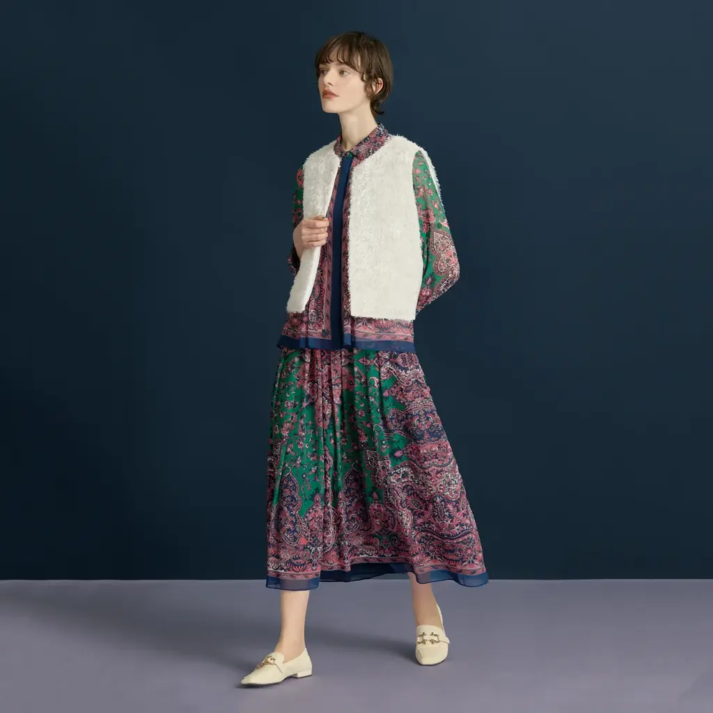 プリントブラウスとスカートのセットアップにシャギー素材のジレを合わせるスタイル。ベスト ¥47,300(税込)商品コード:PRJAE05430。ブラウス・スカートはそれぞれ上記のRattiプリントアイテム。 - プリントが主役の秋ニット