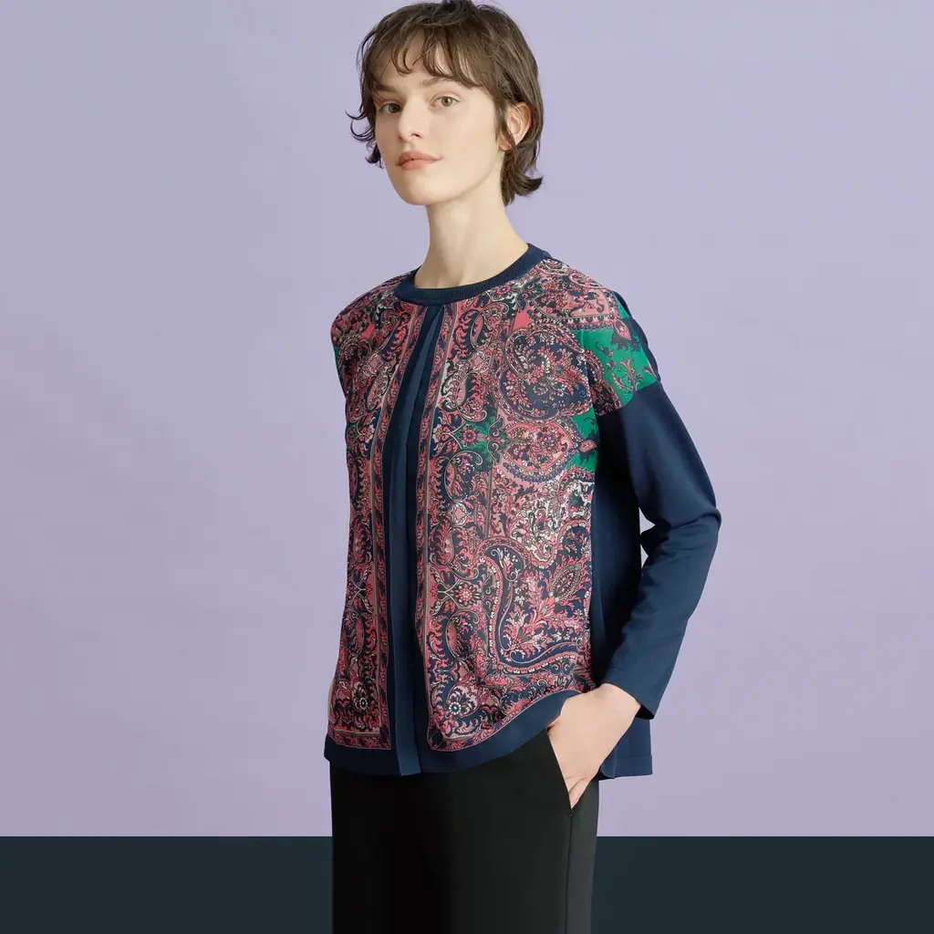 今回のコラボレーションでは、まず140cm四方の大判スカーフに大胆に配されたペイズリー柄と、ネイビーのフレームが出発点となっている。スカーフのように存在感のあるモチーフを、ニット、ブラウス、スカートそれぞれに最も美しく見せる配置で落とし込み、裁断は慎重な手作業で行うことで完成度を高めている。