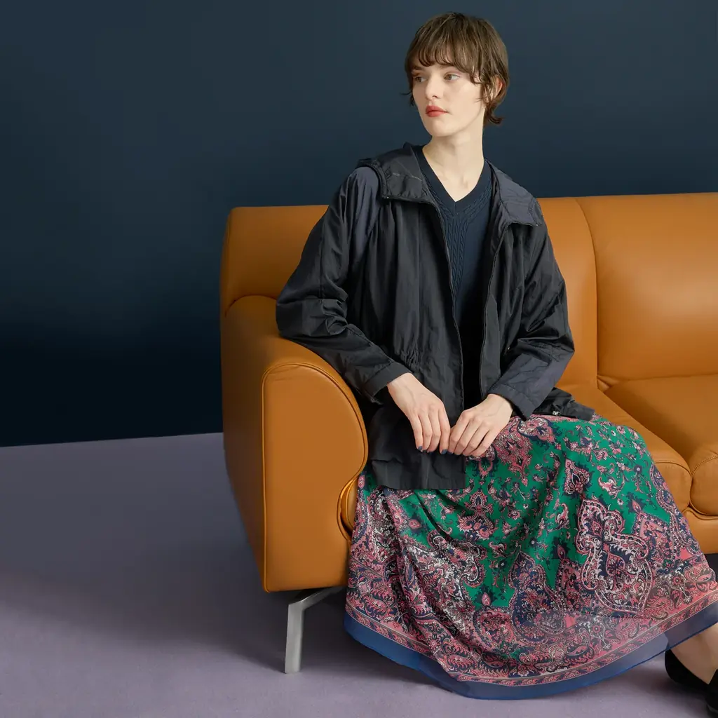 光沢感のあるフーデッドジャケットに浅めVネックのニットとプリントスカートを合わせることで、抜け感と華やぎを両立した着こなしが可能。ジャケット ¥64,900(税込)商品コード:PRJAE10590、ニット ¥33,000(税込)商品コード:PRFAE06300、スカートはPRHAE02690。