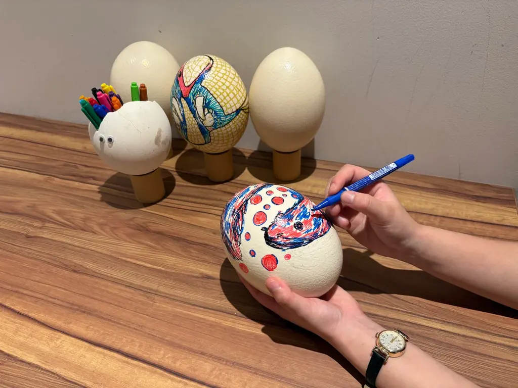 本物のダチョウの卵殻1個を使用して絵付けを行う特別ワークショップです。実施前にダチョウの生態や卵の特徴についての解説があり、完成作品は飾ったり植木鉢にするなど自由に活用できます。