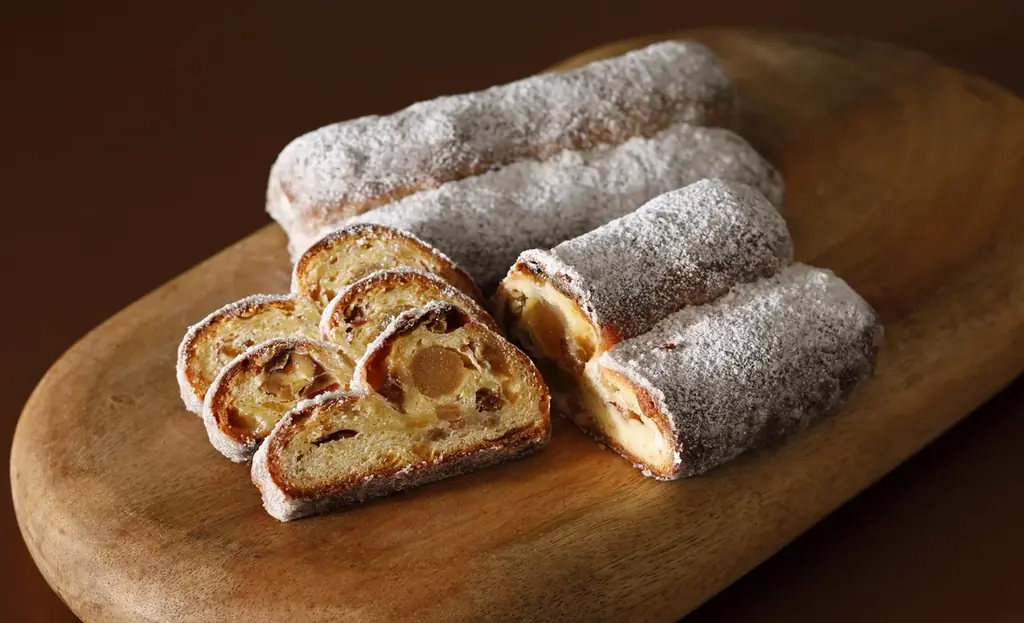 - 新シュトーレン/新江戸シュトーレン: 伝統的なシュトーレンに和の要素を融合。滑らかなこしあん、青ヶ島の「ひんぎゃの塩」を効かせた黒蜜あんこ、くるみの食感。洋酒の代わりに黒蜜をしっかりと染み込ませ、仕上げに上品な甘さの和三盆糖でコーティングしています。