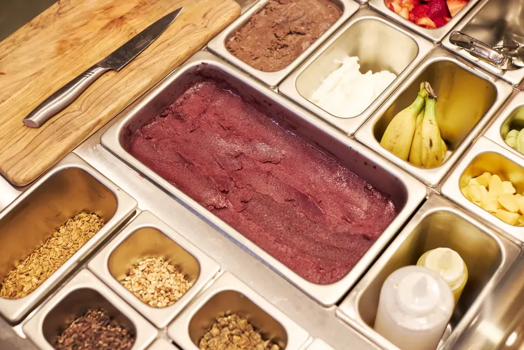 カスタムアサイーは視覚的にも楽しめるよう、カウンターにショーケースを設置。お客様は調理工程を目の前で見ることができ、ライブ感のある注文体験が提供されます。目で見て選べるスタイルは、カスタム要素を直感的に理解する助けとなります。